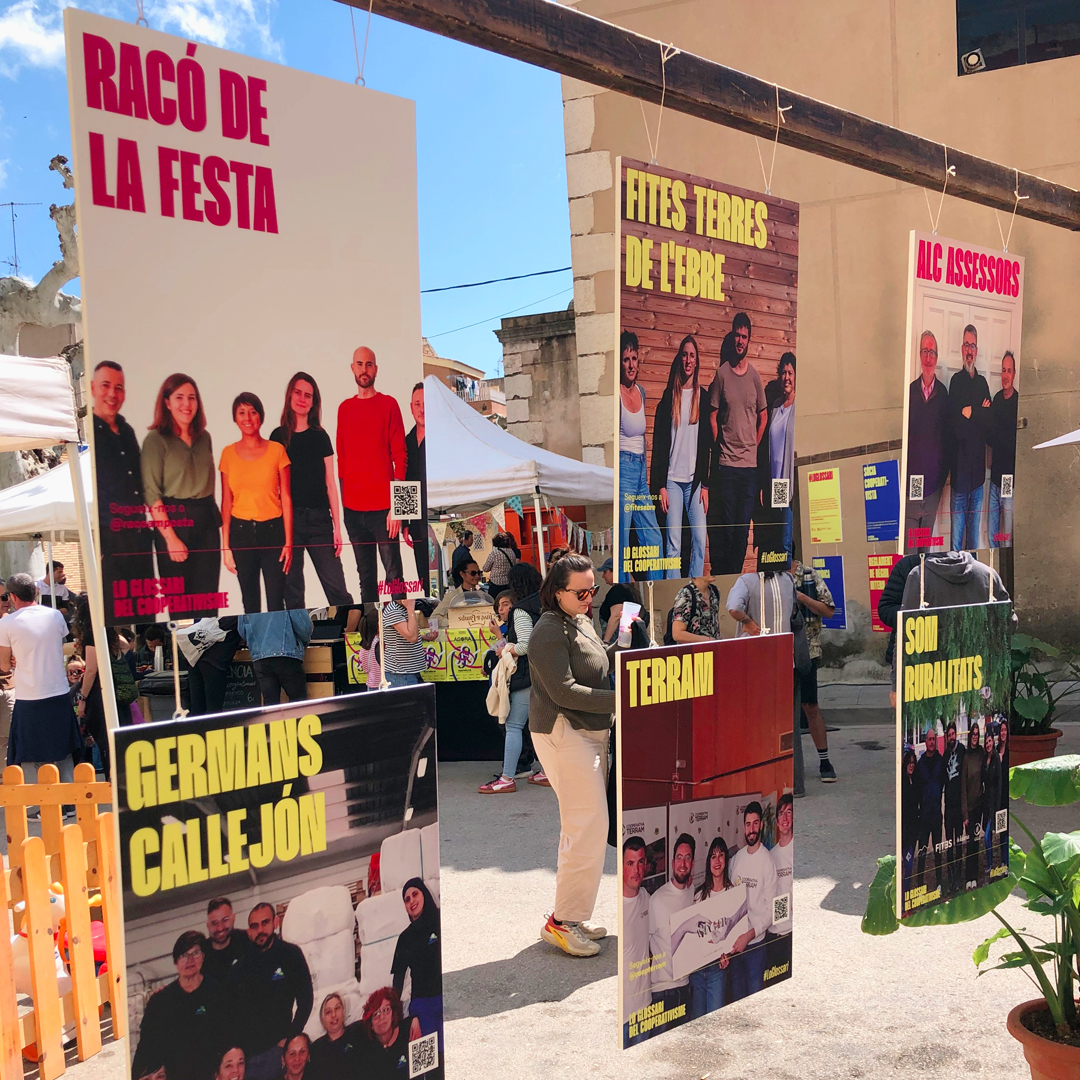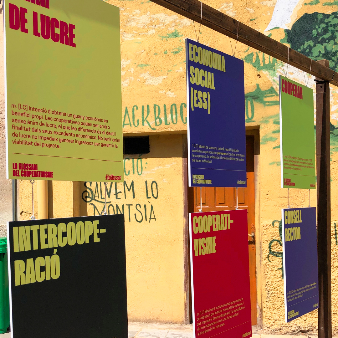 La premissa del projecte era simular una definició de diccionari, però fent-la més propera i atractiva. Per aconseguir-ho, hem treballat amb una paleta de dotze colors que es van repetint en els diversos posts, aportant dinamisme sense generar un desgavell visual. L’ús de tipografies en negreta dona el pes necessari a les definicions i en millora la llegibilitat, especialment en els posts on també apareixen imatges de les cooperatives participants.